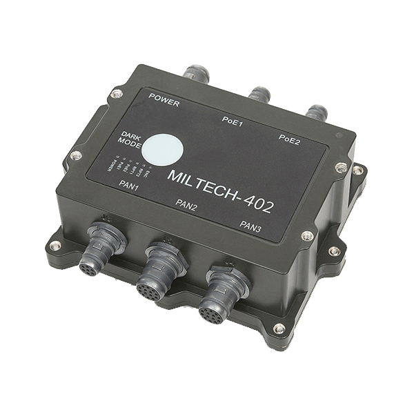 The MILTECH 402 is a rugged, military-grade Fast Ethernet switch with PoE and 5VDC power distribution available over the Ethernet ports.