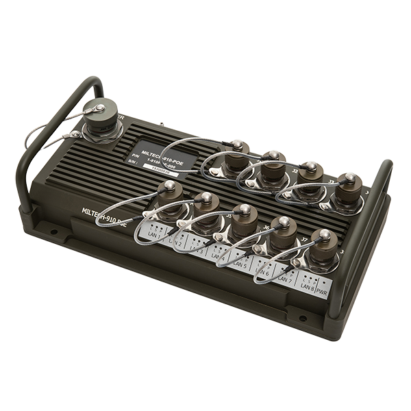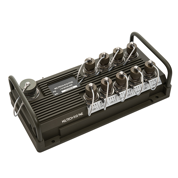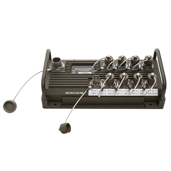 The MILTECH 910-PoE is a rugged Power over Ethernet (PoE) switch that supports 60W of PoE on all 8 Gigabit Ethernet 10/100/1000 ports. It is specifically designed for complex traffic applications featuring IEEE-STD-1588 (PTP) Capabilities and Synchronous Ethernet (SyncE).